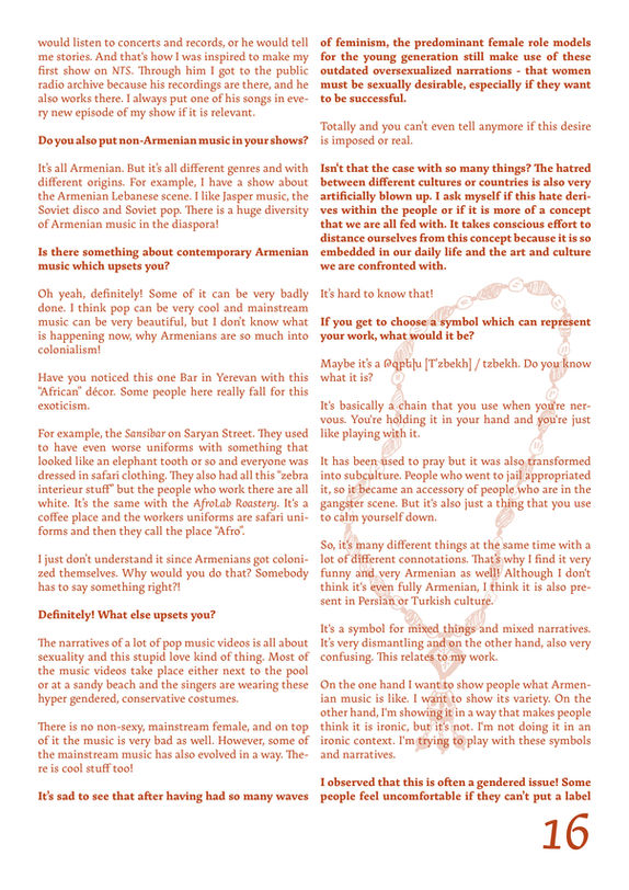 Interviews mit Tiezerk - Eliza Baghdiyan and Lusine Mlke-Galstyan (Musikerinnen und Dozentinnen), Lika Zakaryan (Journalistin), Nana Manucharyan (Keramikkünstlerin und Kunstvermittlerin), Lucia Kagramanyan (DJ und Künstlerin), Yeva Muradyan (Videokünstlerin)