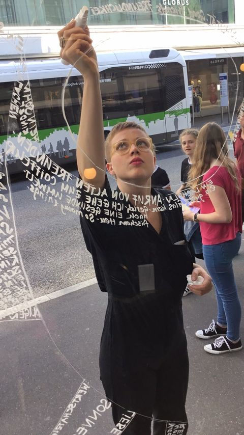 Was bringt Sie zum Strahlen? ist ein performatives Kunst-am-Bau Projekt. Während drei Tagen hat Simona Winkler-Fishyan Passant:innen diese Frage gestellt. Die Antworten hat sie als Glasmalerei in der Form einer Sonne mit Sonnenbrille festgehalten. Das Werk war für einen Monat in der Zuger Innenstadt ausgestellt.